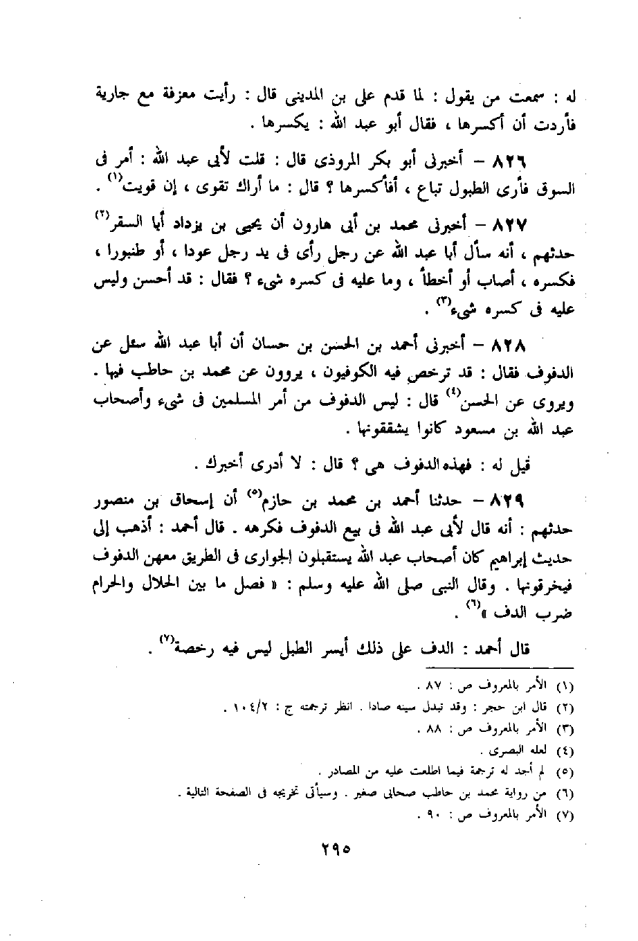 828 - أخبرنى أحمد بن الحسن بن حسان أن أبا عبد اللّه سئل عن الدفوف فقال: قد ترخص فيه الكوفيون، يروون عن محمد بن حاطب فيها.