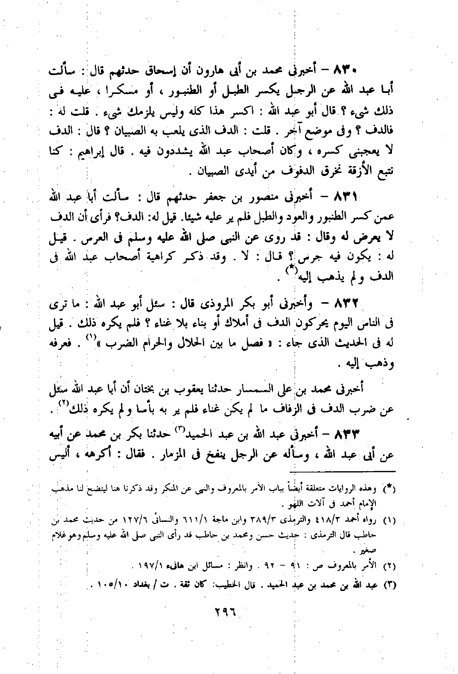 831 - أخبرنى منصور بن جعفر حدثهم قال: سألت أبا عبد اللّه عمن كسر الطنبور والعود والطبل فلم ير عليه شيئا. قيل له: الدف؟ فرأى أن الدف لا يعرض له وقال: قد روى عن النبي صلى اللّه عليه وسلم فى العرس. قيل له: يكون فيه جرس؟ قال: لا. وقد ذكر كراهية أصحاب عبد اللّه فى الدف ولم يذهب إليه «1».