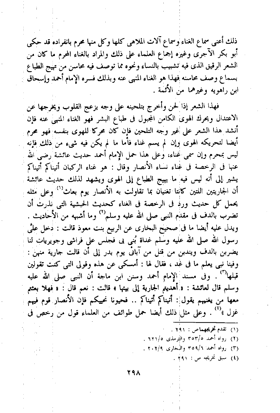 وفينا نبى يعلم ما فى غد، فقال لها: أمسكى عن هذه وقولى التى كنت تقولين قبلها «3». وفى مسند الإمام أحمد وسنن ابن ماجة أن النبي صلى اللّه عليه وسلم قال لعائشة: «أهديتم الجارية إلى بيتها» قالت: نعم قال: «فهلا بعثتم معها من يغنيهم يقول: أتيناكم أتيناكم ... فحيونا نحييكم فإن الأنصار قوم فيهم غزل» «4». وعلى مثل ذلك أيضا حمل طوائف من العلماء قول من رخص فى