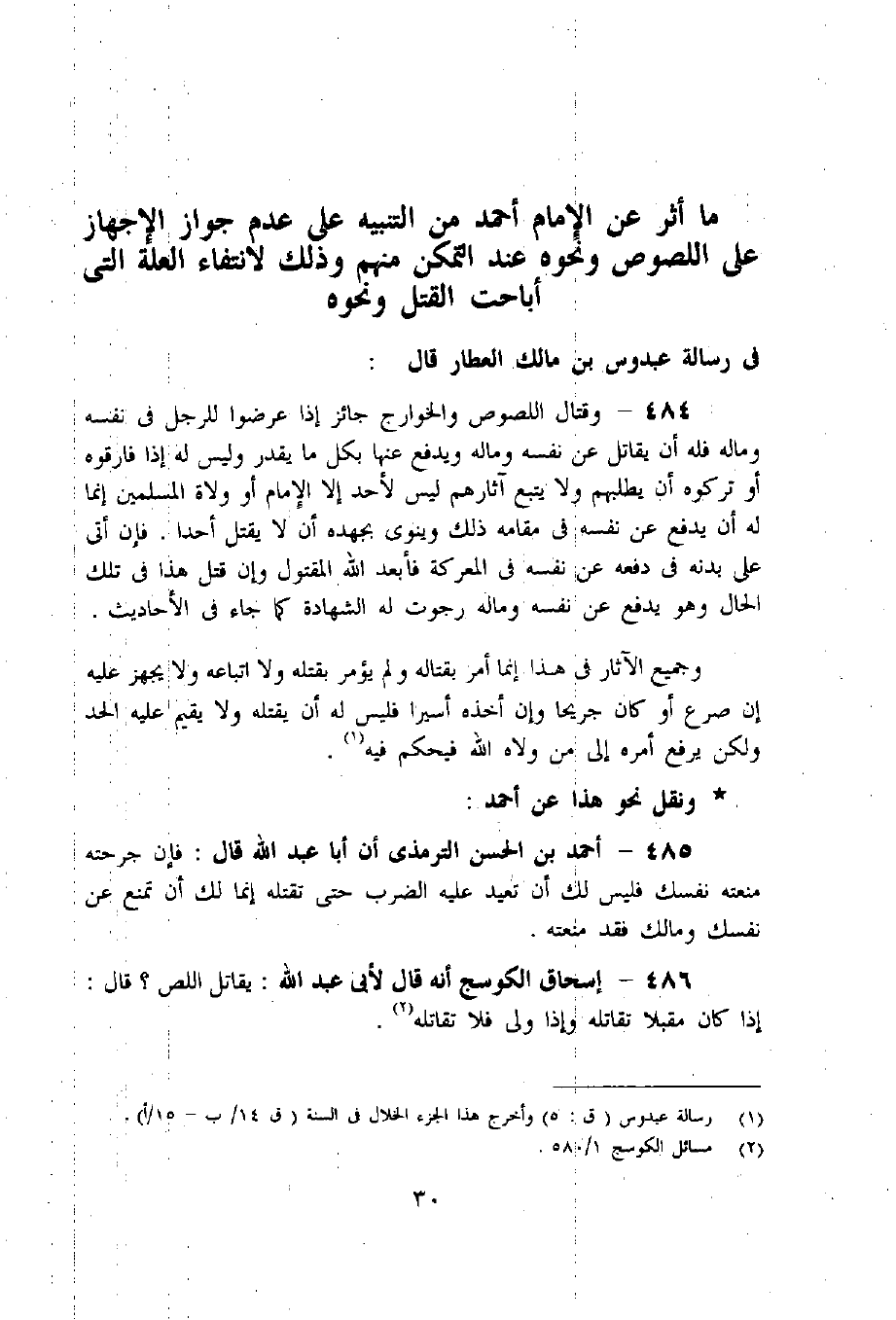 485 - أحمد بن الحسن الترمذي أن أبا عبد اللّه قال: فإن جرحته منعته نفسك فليس لك أن تعيد عليه الضرب حتى تقتله إنما لك أن تمنع عن نفسك ومالك فقد منعته.