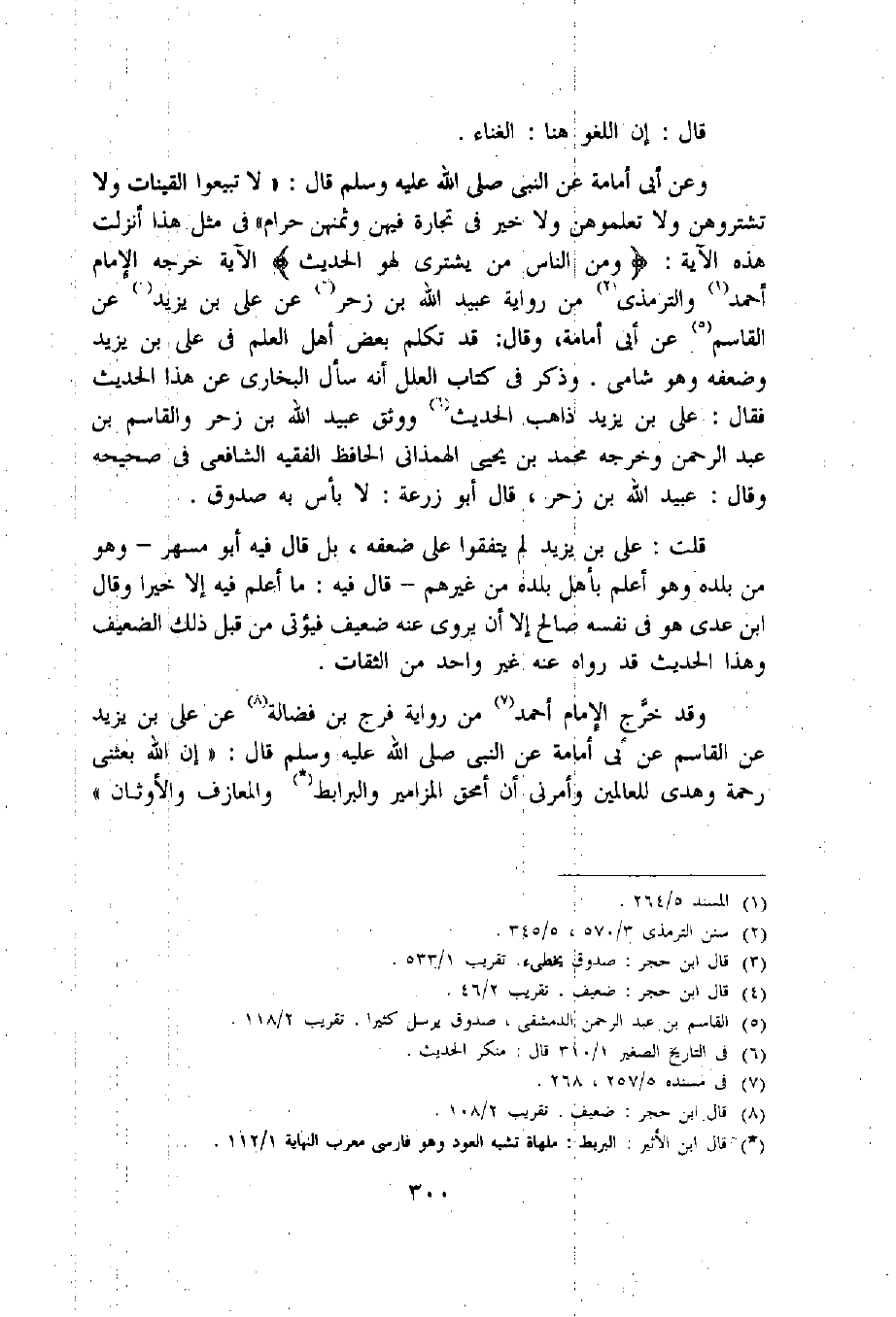 وعن أبى أمامة عن النبي صلى اللّه عليه وسلم قال: «لا تبيعوا القينات ولا تشتروهن ولا تعلموهن ولا خير فى تجارة فيهن وثمنهن حرام» فى مثل هذا أنزلت هذه الآية: ومِنَ النَّاسِ مَنْ يَشْتَرِي لَهْوَ الْحَدِيثِ الآية خرجه الإمام أحمد «1» والترمذي «2» من رواية عبيد اللّه بن زحر «3» عن على بن يزيد «4» عن القاسم «5» عن أبى أمامة، وقال: قد تكلم بعض أهل العلم فى على بن يزيد وضعفه وهو شامى. وذكر فى كتاب العلل أنه سأل البخارى عن هذا الحديث فقال: على بن يزيد ذاهب الحديث «6» ووثق عبيد اللّه بن زحر والقاسم بن عبد الرحمن وخرجه محمد بن يحيى الهمذانى الحافظ الفقيه الشافعى فى صحيحه وقال: عبيد اللّه بن زحر، قال أبو زرعة: لا بأس به صدوق.