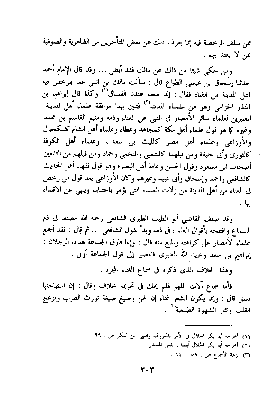 وقد صنف القاضى أبو الطيب الطبرى الشافعى رحمه اللّه مصنفا فى ذم السماع وافتتحه بأقوال العلماء فى ذمه وبدأ بقول الشافعى ... ثم قال: فقد أجمع علماء الأمصار على كراهته والمنع منه قال: وإنما فارق الجماعة هذان الرجلان:
