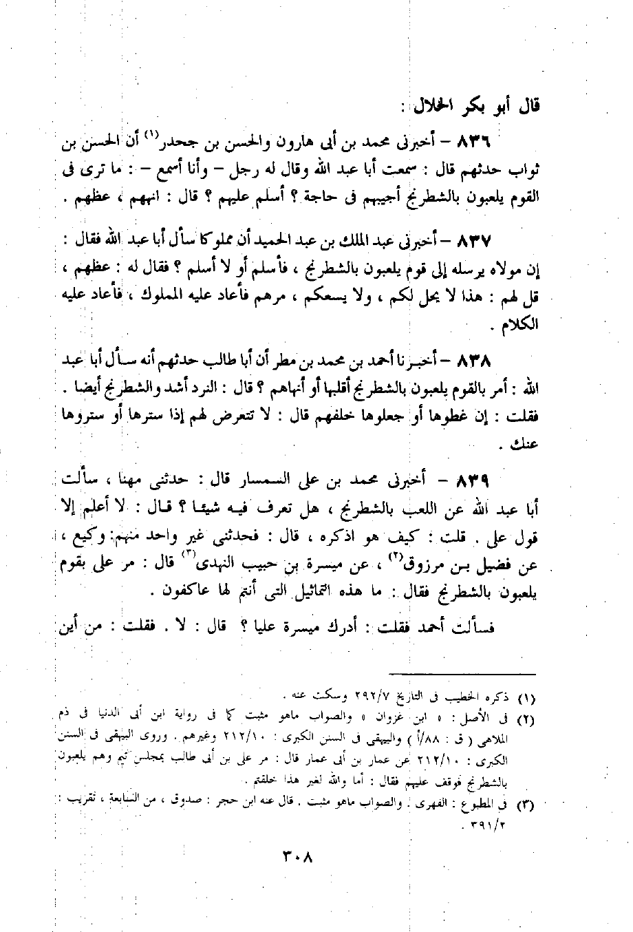 838 - أخبرنا أحمد بن محمد بن مطر أن أبا طالب حدثهم أنه سأل أبا عبد اللّه: أمر بالقوم يلعبون بالشطرنج أقلبها أو أنهاهم؟ قال: النرد أشد والشطرنج أيضا.