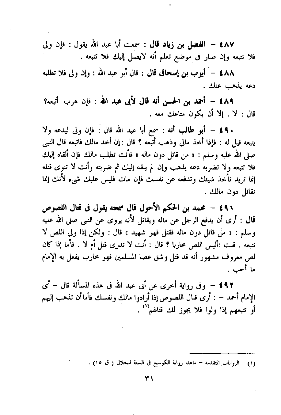 491 - محمد بن الحكم الأحول قال سمعته يقول فى قتال اللصوص قال: أرى أن يدفع الرجل عن ماله ويقاتل لأنه يروى عن النبي صلى اللّه عليه وسلم: «من قاتل دون ماله فقتل فهو شهيد» قال: ولكن إذا ولى اللص لا تتبعه. قلت: أ ليس اللص محاربا؟ قال: أنت لا تدرى قتل أم لا. فأما إذا كان لص معروف مشهور أنه قد قتل وشق عصا المسلمين فهو محارب يفعل به الإمام ما أحب.