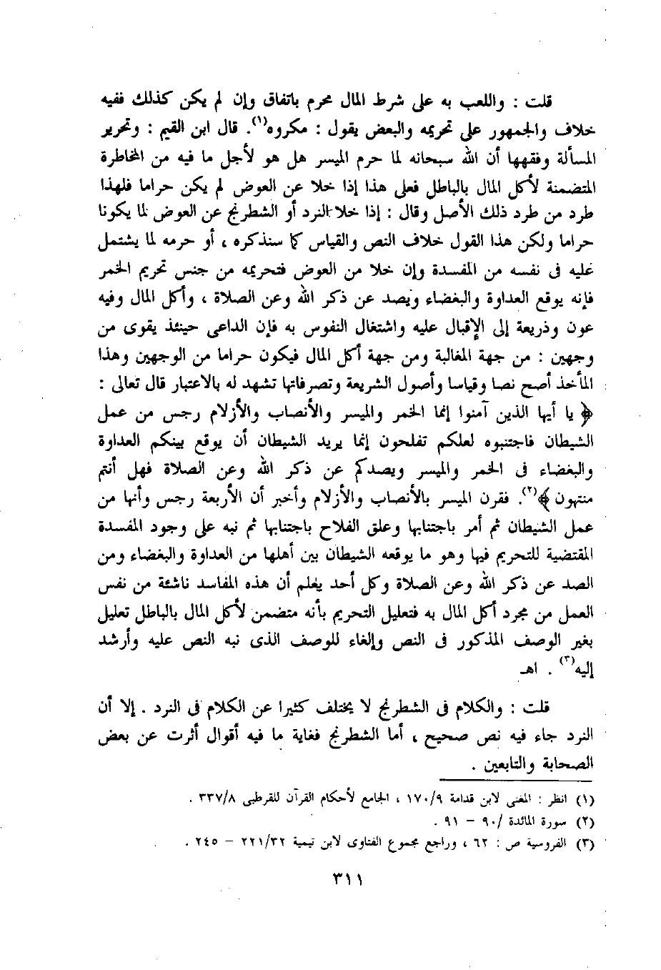 يا أَيُّهَا الَّذِينَ آمَنُوا إِنَّمَا الْخَمْرُ والْمَيْسِرُ والْأَنْصابُ والْأَزْلامُ رِجْسٌ مِنْ عَمَلِ الشَّيْطانِ فَاجْتَنِبُوهُ لَعَلَّكُمْ تُفْلِحُونَ إِنَّما يُرِيدُ الشَّيْطانُ أَنْ يُوقِعَ بَيْنَكُمُ الْعَداوَةَ والْبَغْضاءَ فِي الْخَمْرِ والْمَيْسِرِ ويَصُدَّكُمْ عَنْ ذِكْرِ اللَّهِ وعَنِ الصَّلاةِ فَهَلْ أَنْتُمْ مُنْتَهُونَ «2». فقرن الميسر بالأنصاب والأزلام وأخبر أن الأربعة رجس وأنها من عمل الشيطان ثم أمر باجتنابها وعلق الفلاح باجتنابها ثم نبه على وجود المفسدة المقتضية للتحريم فيها وهو ما يوقعه الشيطان بين أهلها من العداوة والبغضاء ومن الصد عن ذكر اللّه وعن الصلاة وكل أحد يعلم أن هذه المفاسد ناشئة من نفس العمل من مجرد أكل المال به فتعليل التحريم بأنه متضمن لأكل المال بالباطل تعليل بغير الوصف المذكور فى النص وإلغاء للوصف الّذي نبه النص عليه وأرشد إليه «3». اه