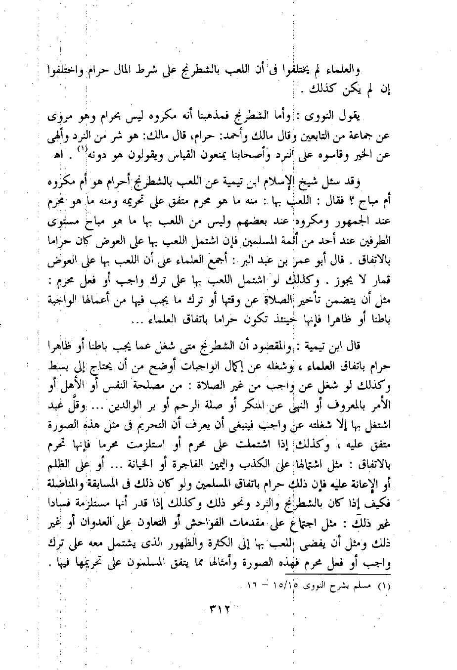 والعلماء لم يختلفوا فى أن اللعب بالشطرنج على شرط المال حرام واختلفوا إن لم يكن كذلك.