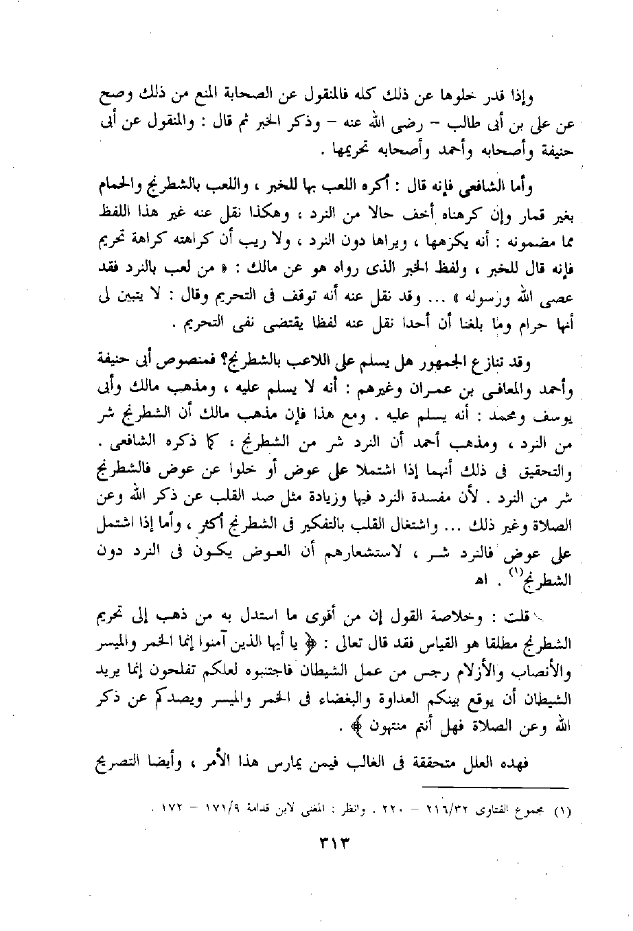 قلت: وخلاصة القول إن من أقوى ما استدل به من ذهب إلى تحريم الشطرنج مطلقا هو القياس فقد قال تعالى: يا أَيُّهَا الَّذِينَ آمَنُوا إِنَّمَا الْخَمْرُ والْمَيْسِرُ والْأَنْصابُ والْأَزْلامُ رِجْسٌ مِنْ عَمَلِ الشَّيْطانِ فَاجْتَنِبُوهُ لَعَلَّكُمْ تُفْلِحُونَ إِنَّما يُرِيدُ الشَّيْطانُ أَنْ يُوقِعَ بَيْنَكُمُ الْعَداوَةَ والْبَغْضاءَ فِي الْخَمْرِ والْمَيْسِرِ ويَصُدَّكُمْ عَنْ ذِكْرِ اللَّهِ وعَنِ الصَّلاةِ فَهَلْ أَنْتُمْ مُنْتَهُونَ.