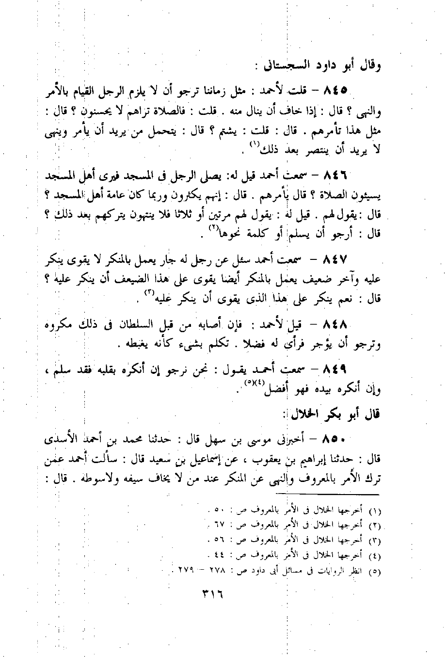 850 - أخبرنى موسى بن سهل قال: حدثنا محمد بن أحمد الأسدى قال: حدثنا إبراهيم بن يعقوب، عن إسماعيل بن سعيد قال: سألت أحمد عمن ترك الأمر بالمعروف والنهى عن المنكر عند من لا يخاف سيفه ولا سوطه. قال: