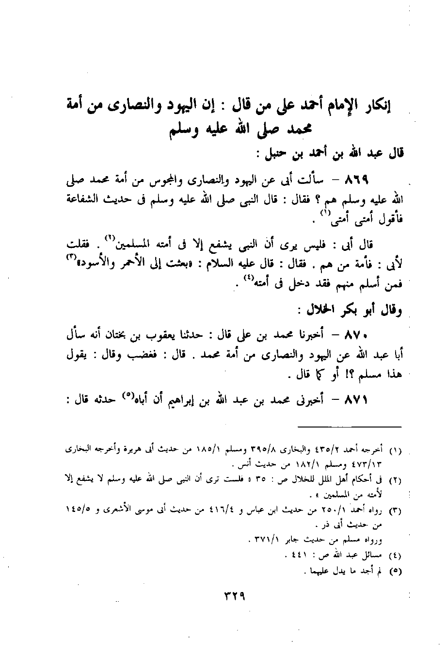 869 - سألت أبى عن اليهود والنصارى والمجوس من أمة محمد صلى اللّه عليه وسلم هم؟ فقال: قال النبي صلى اللّه عليه وسلم فى حديث الشفاعة فأقول أمتى أمتى «1».