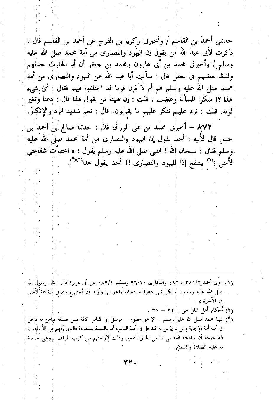 872 - أخبرنى محمد بن على الوراق قال: حدثنا صالح بن أحمد بن حنبل قال لأبيه: أحد يقول إن اليهود والنصارى من أمة محمد صلى اللّه عليه وسلم فقال: سبحان اللّه! النبي صلى اللّه عليه وسلم يقول: «اختبأت شفاعتى لأمتى» «1» يشفع إذا لليهود والنصارى!! أحد يقول هذا «2» «3».