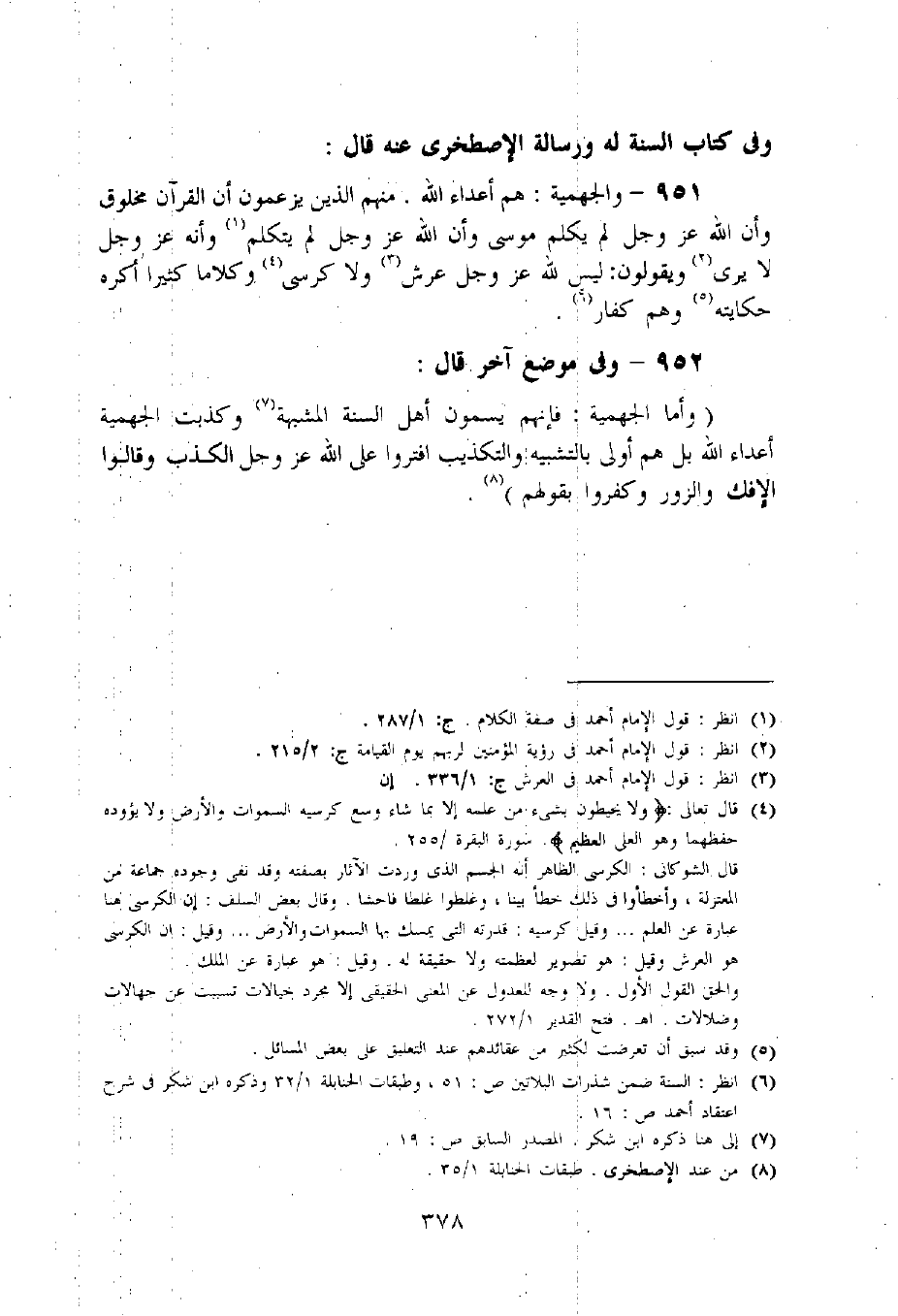 951 - والجهمية: هم أعداء اللّه. منهم الذين يزعمون أن القرآن مخلوق وأن اللّه عز وجل لم يكلم موسى وأن اللّه عز وجل لم يتكلم «1» وأنه عز وجل لا يرى «2» ويقولون: ليس للّه عز وجل عرش «3» ولا كرسى «4» وكلاما كثيرا أكره حكايته «5» وهم كفار «6».