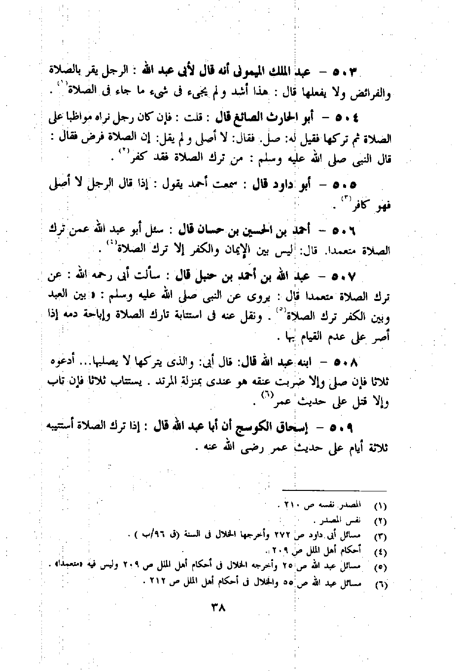 507 - عبد اللّه بن أحمد بن حنبل قال: سألت أبى رحمه اللّه: عن ترك الصلاة متعمدا قال: يروى عن النبي صلى اللّه عليه وسلم: «بين العبد وبين الكفر ترك الصلاة «5». ونقل عنه فى استتابة تارك الصلاة وإباحة دمه إذا أصر على عدم القيام بها.