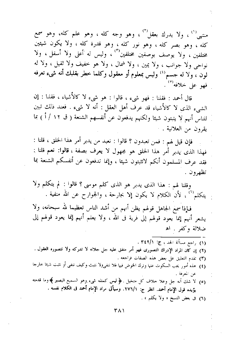 (5) لا شك أنه جل وعلا خلاف كل متخيل. لَيْسَ كَمِثْلِهِ شَيْءٌ وهُوَ السَّمِيعُ الْبَصِيرُ وما قدمته يؤيده قول الإمام أحمد. انظر ج: 1/ 276. وسيأتى مراد الإمام أحمد فى الكلام نفسه.
