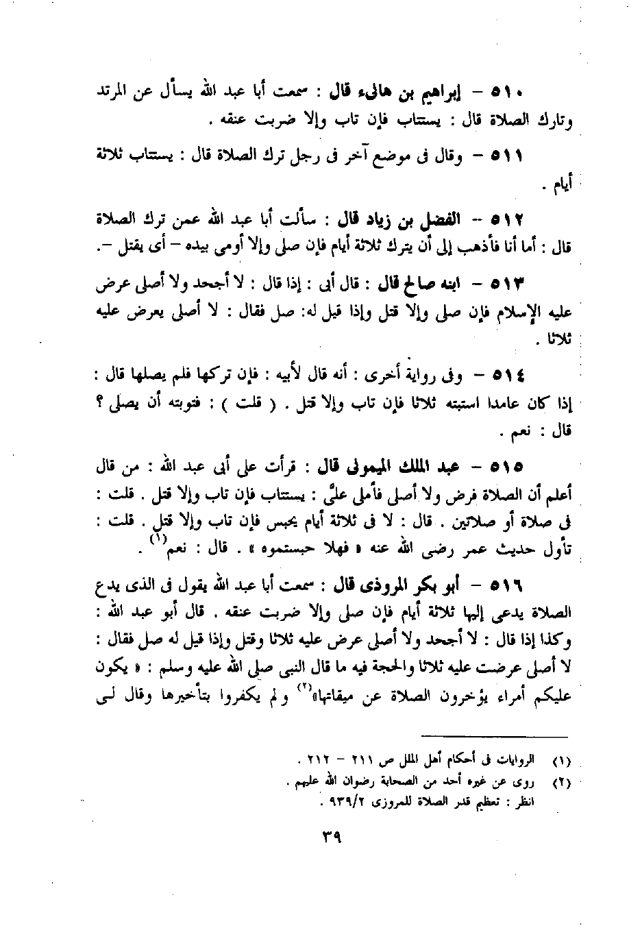 516 - أبو بكر المروزي قال: سمعت أبا عبد اللّه يقول فى الّذي يدع الصلاة يدعى إليها ثلاثة أيام فإن صلى وإلا ضربت عنقه. قال أبو عبد اللّه: