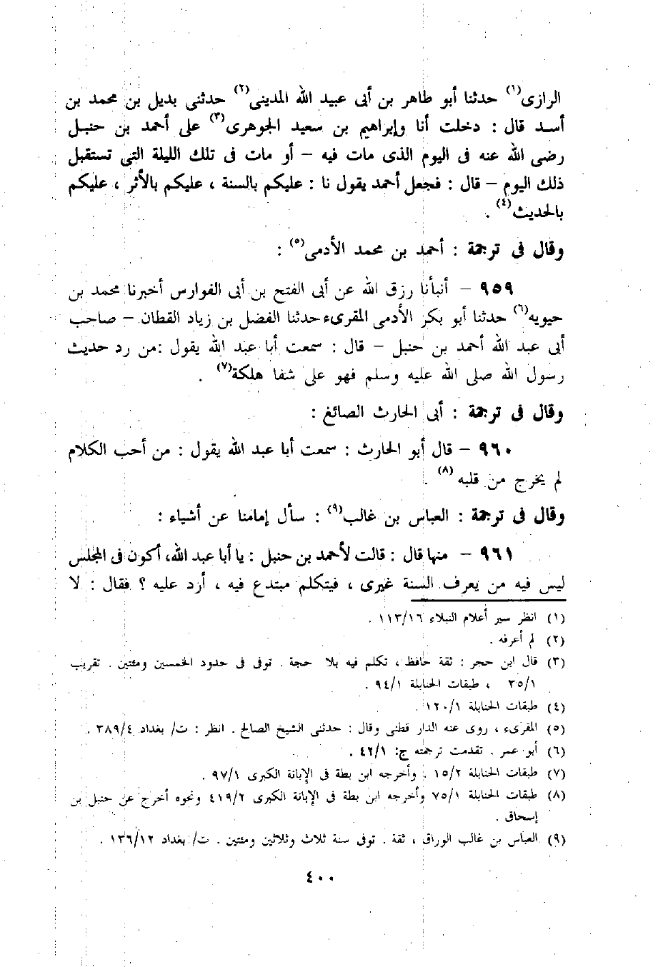 959 - أنبأنا رزق اللّه عن أبى الفتح بن أبى الفوارس أخبرنا محمد بن حيويه «6» حدثنا أبو بكر الأدمى المقرئ حدثنا الفضل بن زياد القطان- صاحب أبى عبد اللّه أحمد بن حنبل- قال: سمعت أبا عبد اللّه يقول: من رد حديث رسول اللّه صلى اللّه عليه وسلم فهو على شفا هلكة «7».