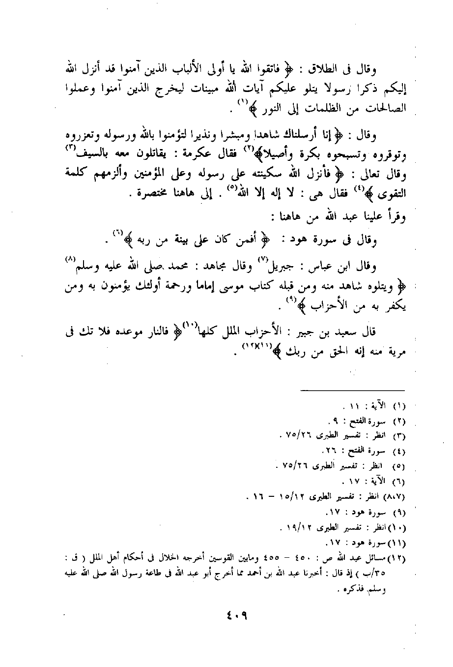 وقال: إِنَّا أَرْسَلْناكَ شاهِداً ومُبَشِّراً ونَذِيراً لِتُؤْمِنُوا بِاللَّهِ ورَسُولِهِ وتُعَزِّرُوهُ وتُوَقِّرُوهُ وتُسَبِّحُوهُ بُكْرَةً وأَصِيلًا «2» فقال عكرمة: يقاتلون معه بالسيف «3» وقال تعالى: فَأَنْزَلَ اللَّهُ سَكِينَتَهُ عَلى رَسُولِهِ وعَلَى الْمُؤْمِنِينَ وأَلْزَمَهُمْ كَلِمَةَ التَّقْوى «4» فقال هى: لا إله إلا اللّه «5». إلى هاهنا مختصرة.
