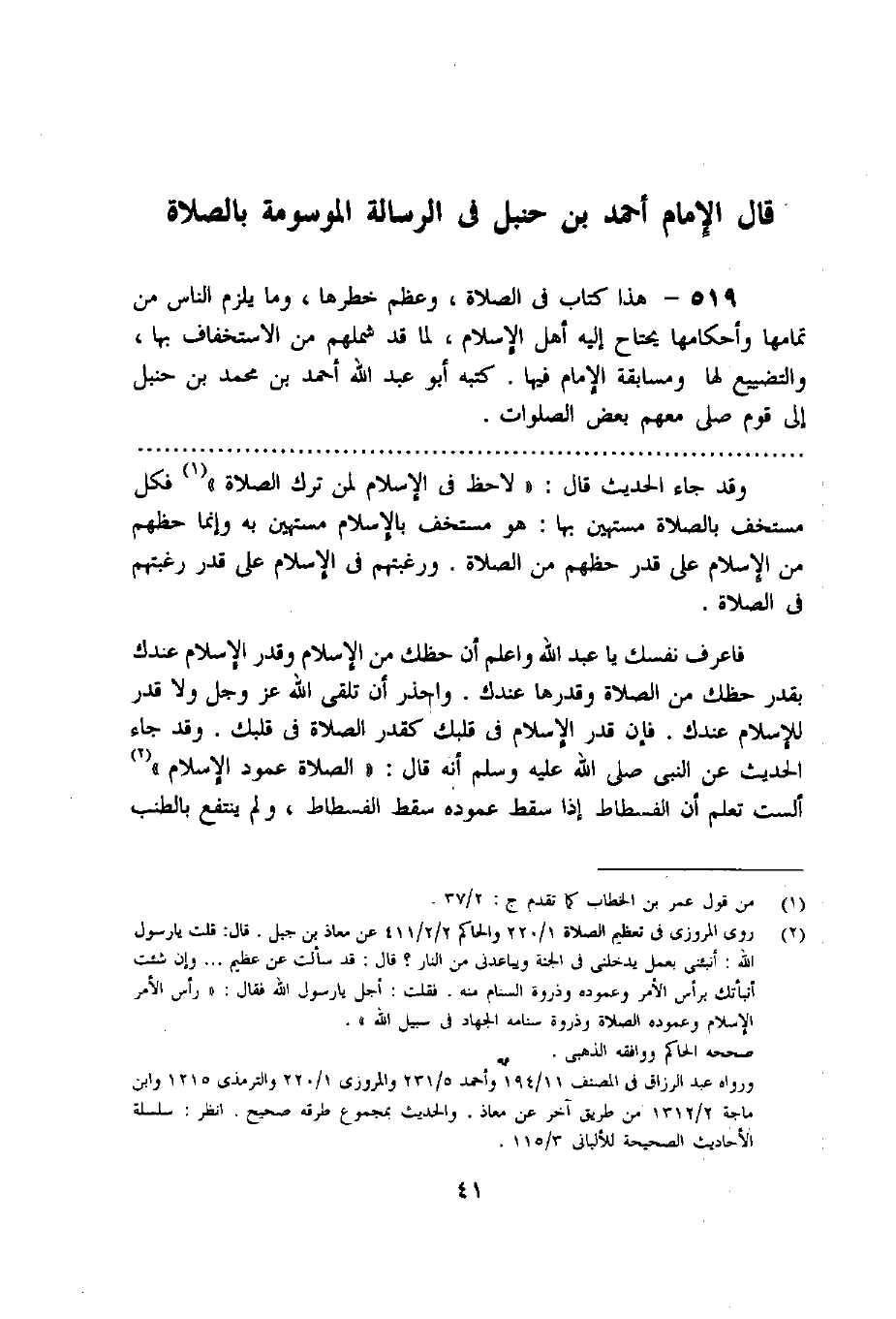 519 - هذا كتاب فى الصلاة، وعظم خطرها، وما يلزم الناس من تمامها وأحكامها يحتاج إليه أهل الإسلام، لما قد شملهم من الاستخفاف بها، والتضييع لها ومسابقة الإمام فيها. كتبه أبو عبد اللّه أحمد بن محمد بن حنبل إلى قوم صلى معهم بعض الصلوات.