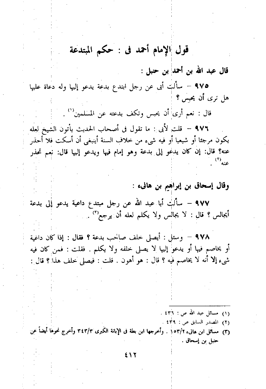 (3) مسائل ابن هانئ 2/ 153. وأخرجها ابن بطة فى الإبانة الكبرى 3/ 343 وأخرج نحوها أيضا عن حنبل بن إسحاق.