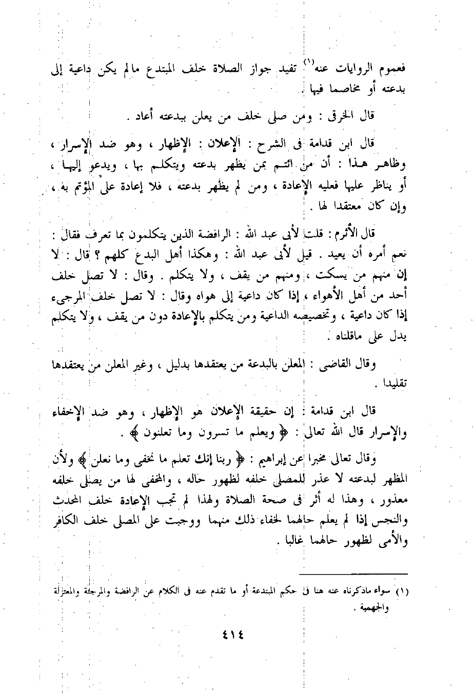 قال ابن قدامة فى الشرح: الإعلان: الإظهار، وهو ضد الإسرار، وظاهر هذا: أن من ائتم بمن يظهر بدعته ويتكلم بها، ويدعو إليها، أو يناظر عليها فعليه الإعادة، ومن لم يظهر بدعته، فلا إعادة على المؤتم به، وإن كان معتقدا لها.