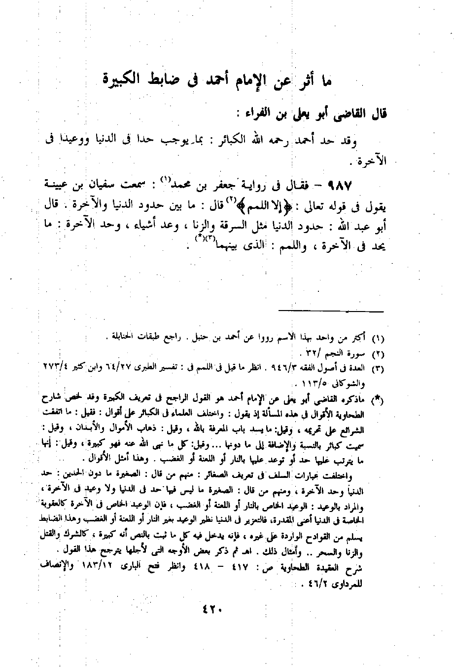 (4) ما ذكره القاضى أبو يعلى عن الإمام أحمد هو القول الراجح فى تعريف الكبيرة وقد لخص شارح الطحاوية الأقوال فى هذه المسألة إذ يقول: واختلف العلماء فى الكبائر على أقوال: فقيل: ما اتفقت الشرائع على تحريمه، وقيل: ما يسد باب المعرفة باللّه، وقيل: ذهاب الأموال والأبدان، وقيل: