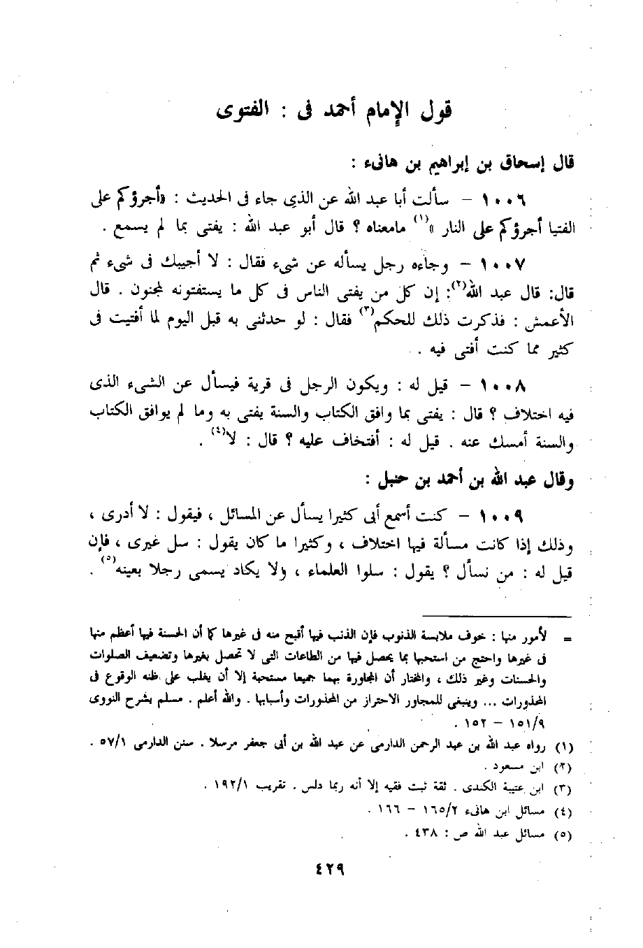 1008 - قيل له: ويكون الرجل فى قرية فيسأل عن الشيء الّذي فيه اختلاف؟ قال: يفتى بما وافق الكتاب والسنة يفتى به وما لم يوافق الكتاب والسنة أمسك عنه. قيل له: أ فتخاف عليه؟ قال: لا «4».