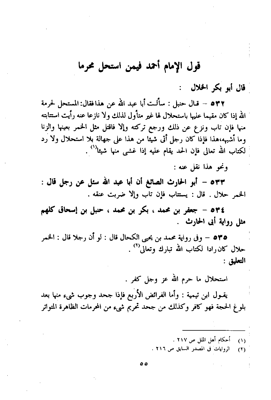 532 - قال حنبل: سألت أبا عبد اللّه عن هذا فقال: المستحل لحرمة اللّه إذا كان مقيما عليها باستحلال لها غير متأول لذلك ولا نازعا عنه رأيت استتابته منها فإن تاب ونزع عن ذلك ورجع تركته وإلا فاقتل مثل الخمر بعينها والزنا وما أشبهه، هذا فإذا كان رجل أتى شيئا من هذا على جهالة بلا استحلال ولا رد لكتاب اللّه تعالى فإن الحد يقام عليه إذا غشى منها شيئا «1».