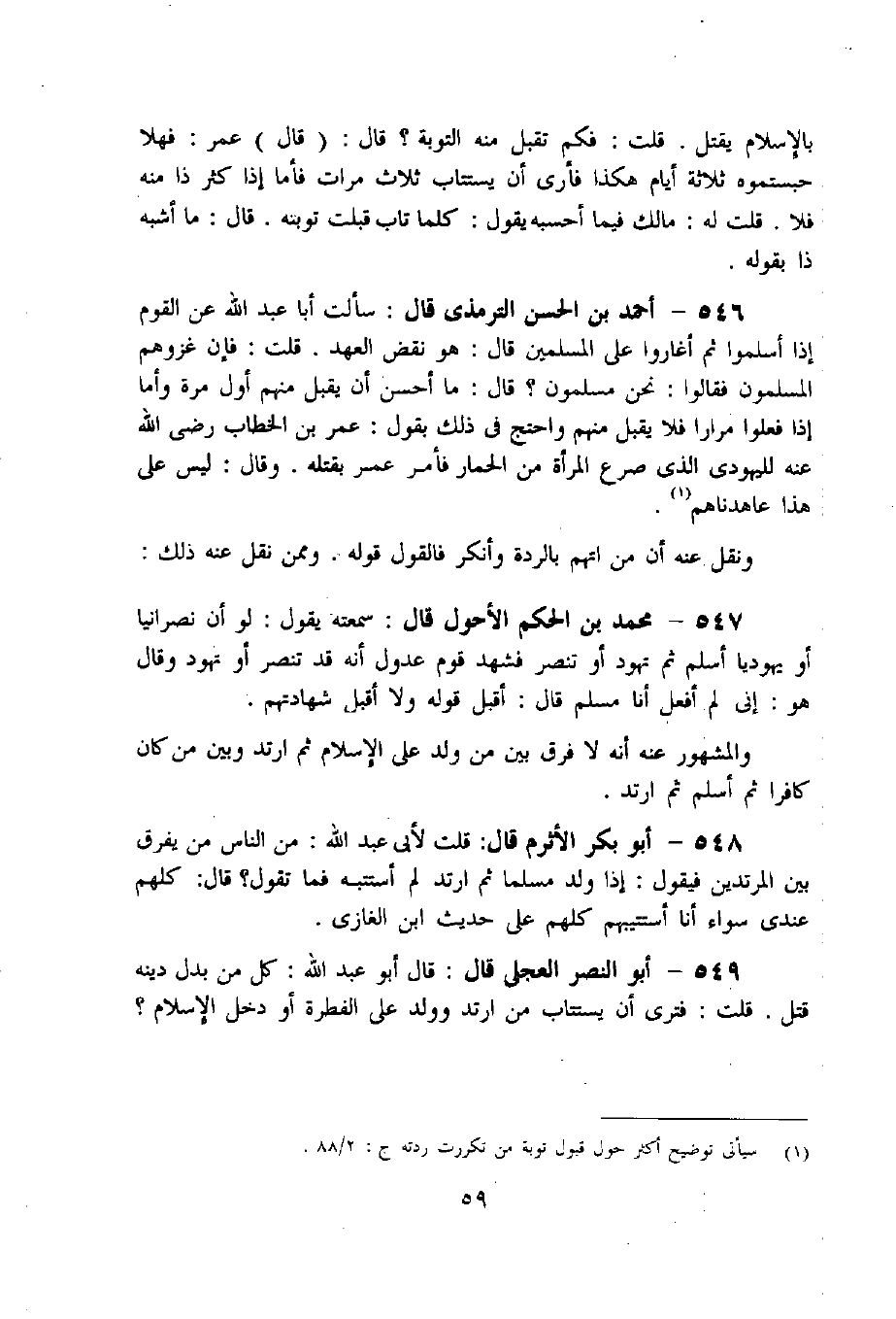 548 - أبو بكر الأثرم قال: قلت لأبى عبد اللّه: من الناس من يفرق بين المرتدين فيقول: إذا ولد مسلما ثم ارتد لم أستتبه فما تقول؟ قال: كلهم عندى سواء أنا أستتيبهم كلهم على حديث ابن الغازى.