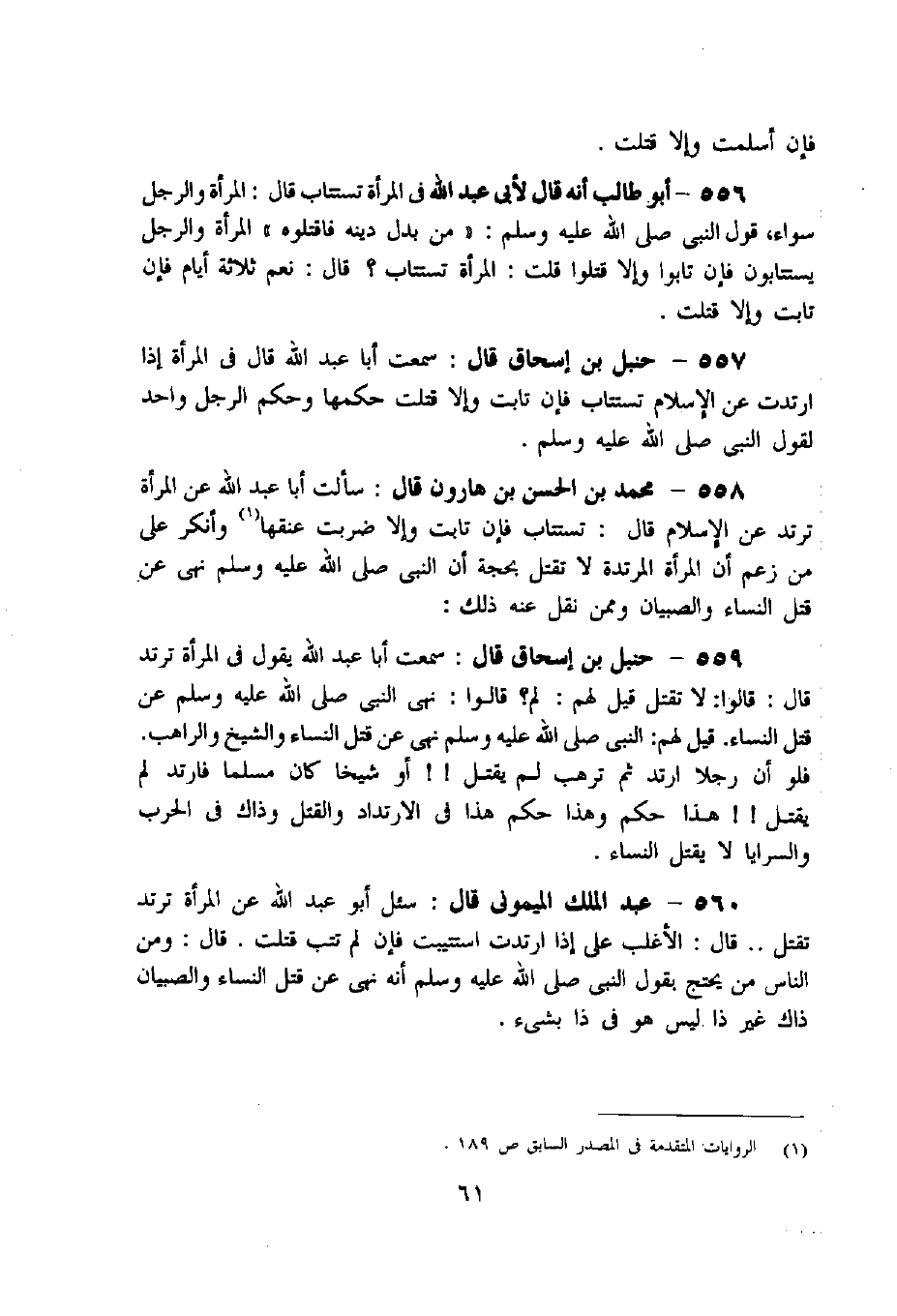 559 - حنبل بن إسحاق قال: سمعت أبا عبد اللّه يقول فى المرأة ترتد قال: قالوا: لا تقتل قيل لهم: لم؟ قالوا: نهى النبي صلى اللّه عليه وسلم عن قتل النساء. قيل لهم: النبي صلى اللّه عليه وسلم نهى عن قتل النساء والشيخ والراهب.