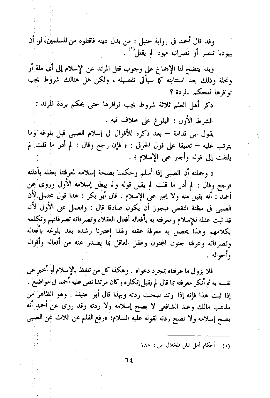 «و جملته أن الصبى إذا أسلم وحكمنا بصحة إسلامه لمعرفتنا بعقله بأدلته فرجع وقال: لم أدر ما قلت لم يقبل قوله ولم يبطل إسلامه الأول وروى عن أحمد: أنه يقبل منه ولا يجبر على الإسلام. قال أبو بكر: هذا قول محتمل لأن الصبى فى مظنة النقص فيجوز أن يكون صادقا قال: والعمل على الأول لأنه قد ثبت عقله للإسلام ومعرفته به بأفعاله أفعال العقلاء وتصرفاته تصرفاتهم وتكلمه بكلامهم وهذا يحصل به معرفة عقله ولهذا اعتبرنا رشده بعد بلوغه بأفعاله وتصرفاته وعرفنا جنون المجنون وعقل العاقل بما يصدر عنه من أفعاله وأقواله وأحواله.