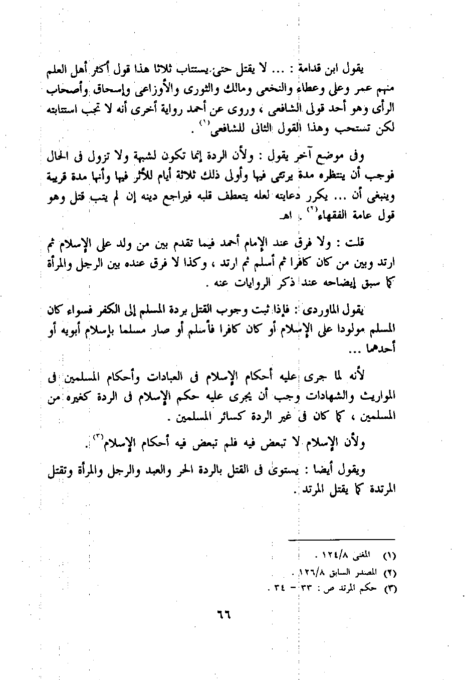 ويقول أيضا: يستوى فى القتل بالردة الحر والعبد والرجل والمرأة وتقتل المرتدة كما يقتل المرتد.