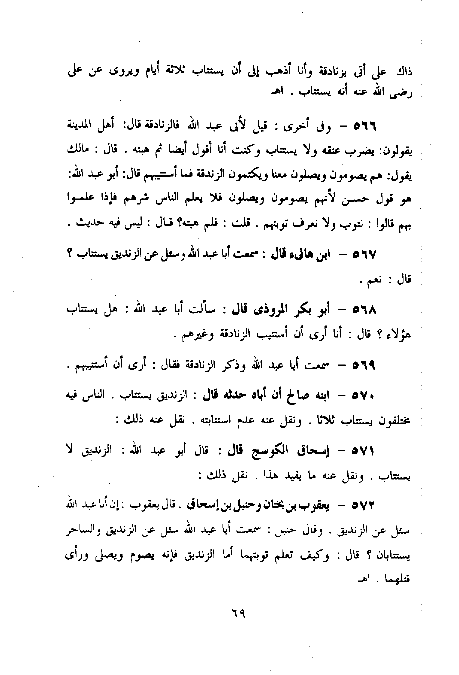 570 - ابنه صالح أن أباه حدثه قال: الزنديق يستتاب. الناس فيه مختلفون يستتاب ثلاثا. ونقل عنه عدم استتابته. نقل عنه ذلك: