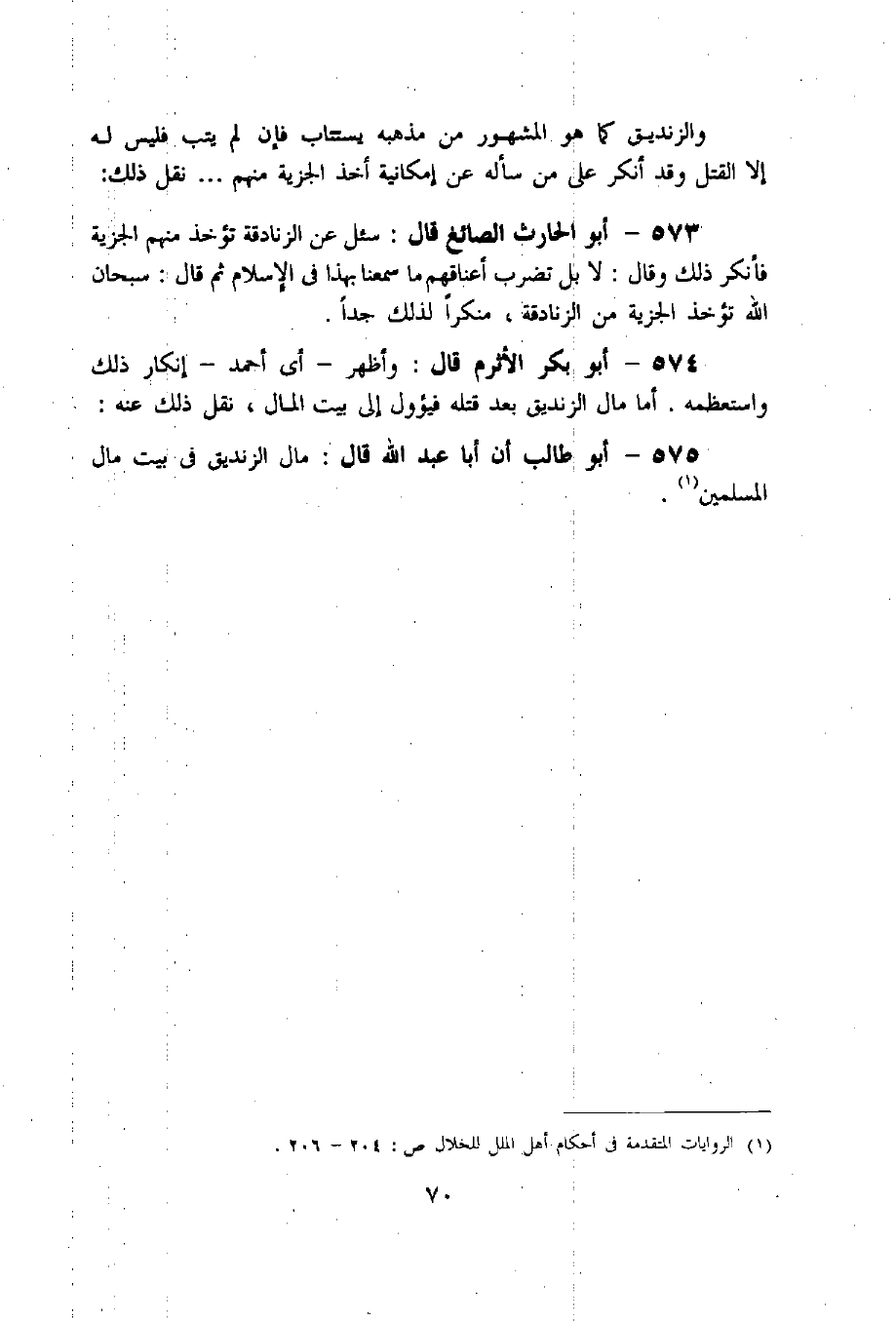 574 - أبو بكر الأثرم قال: وأظهر- أى أحمد- إنكار ذلك واستعظمه. أما مال الزنديق بعد قتله فيؤول إلى بيت المال، نقل ذلك عنه: