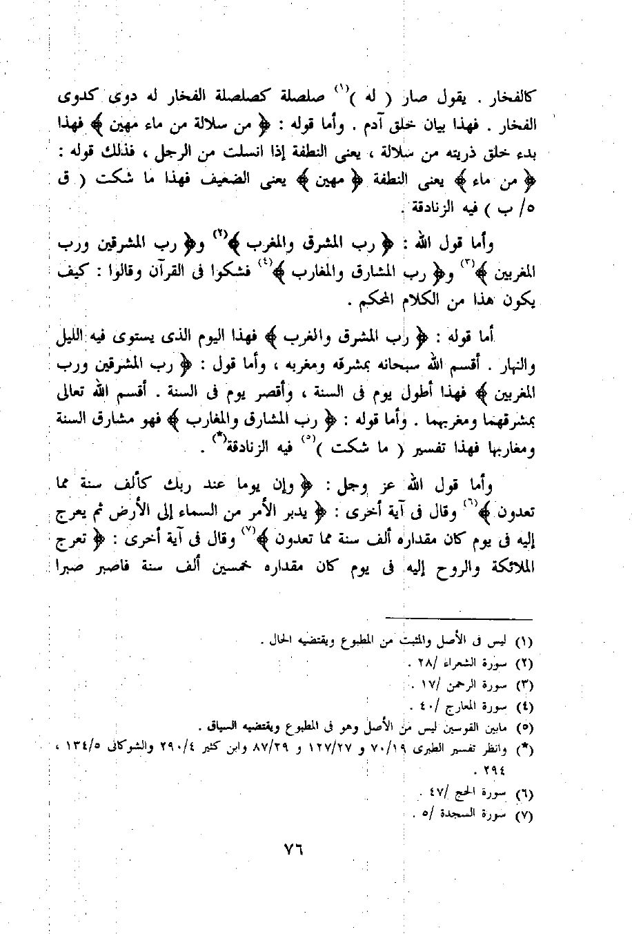 أما قوله: رَبُّ الْمَشْرِقِ والْمَغْرِبِ فهذا اليوم الّذي يستوى فيه الليل والنهار. أقسم اللّه سبحانه بمشرقه ومغربه، وأما قول: رَبُّ الْمَشْرِقَيْنِ ورَبُّ الْمَغْرِبَيْنِ فهذا أطول يوم فى السنة، وأقصر يوم فى السنة. أقسم اللّه تعالى بمشرقهما ومغربهما. وأما قوله: بِرَبِّ الْمَشارِقِ والْمَغارِبِ فهو مشارق السنة ومغاربها فهذا تفسير (ما شكت) «5» فيه الزنادقة «6».