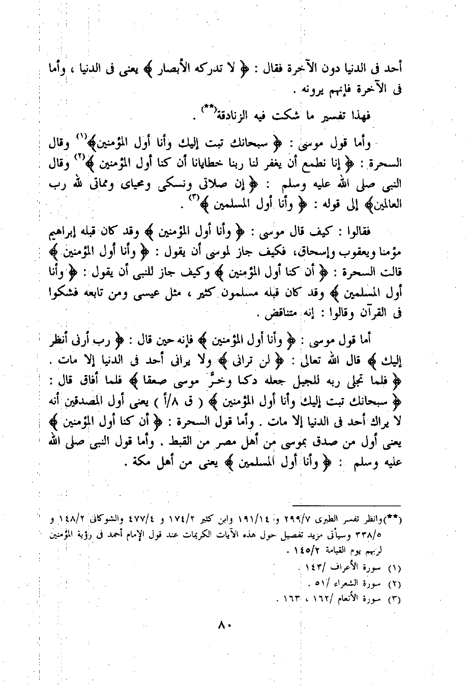 (1) وانظر تفسير الطبرى 7/ 299 و14/ 191 وابن كثير 2/ 174 و4/ 477 والشوكانى 2/ 148 و5/ 338 وسيأتى مزيد تفصيل حول هذه الآيات الكريمات عند قول الإمام أحمد فى رؤية المؤمنين لربهم يوم القيامة 2/ 145.