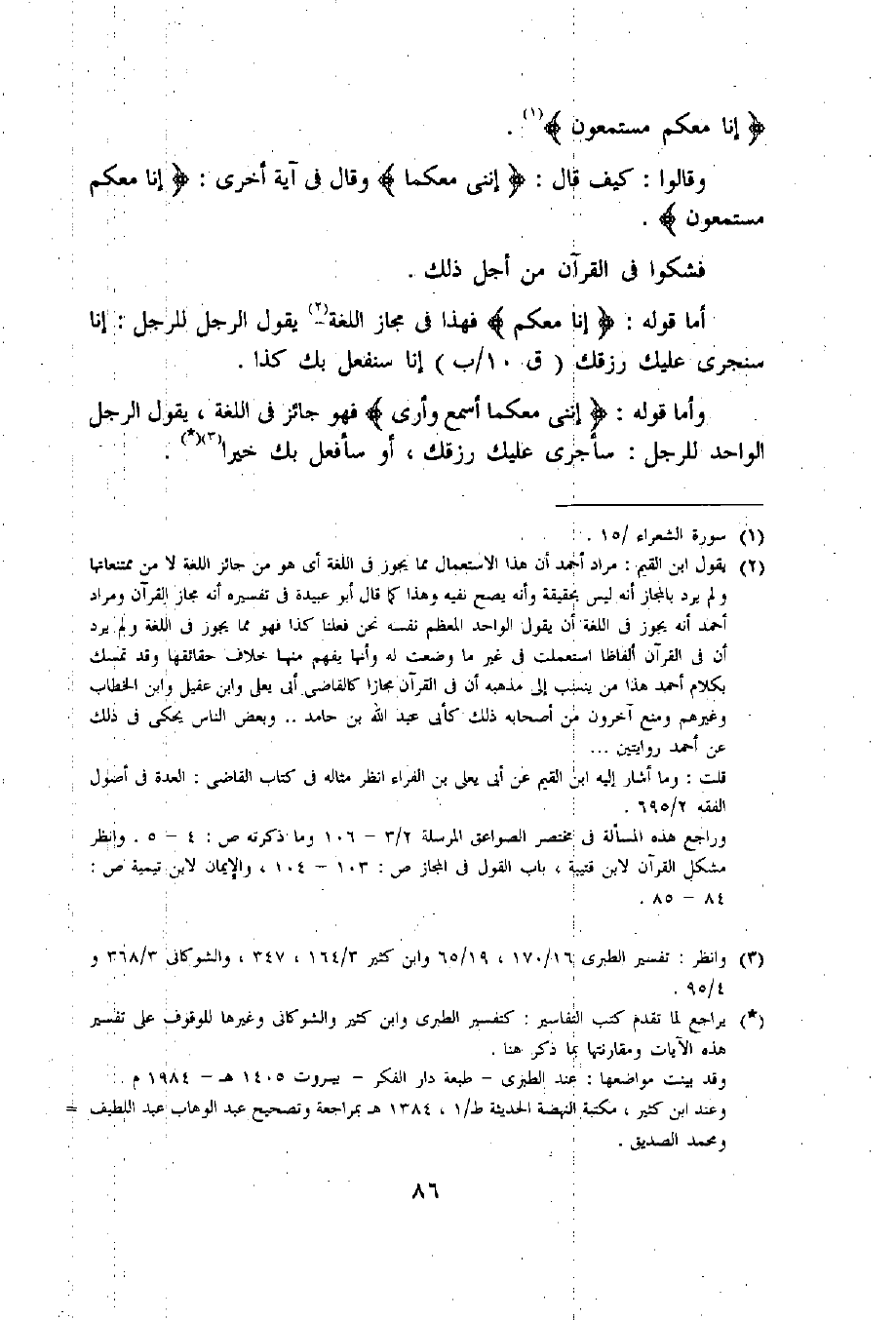 (2) يقول ابن القيم: مراد أحمد أن هذا الاستعمال مما يجوز فى اللغة أى هو من جائز اللغة لا من ممتنعاتها ولم يرد بالمجاز أنه ليس بحقيقة وأنه يصح نفيه وهذا كما قال أبو عبيدة فى تفسيره أنه مجاز القرآن ومراد أحمد أنه يجوز فى اللغة أن يقول الواحد المعظم نفسه نحن فعلنا كذا فهو مما يجوز فى اللغة ولم يرد أن فى القرآن ألفاظا استعملت فى غير ما وضعت له وأنها يفهم منها خلاف حقائقها وقد تمسك بكلام أحمد هذا من ينسب إلى مذهبه أن فى القرآن مجازا كالقاضى أبى يعلى وابن عقيل وابن الخطاب وغيرهم ومنع آخرون من أصحابه ذلك كأبي عبد اللّه بن حامد .. وبعض الناس يحكى فى ذلك عن أحمد روايتين ...