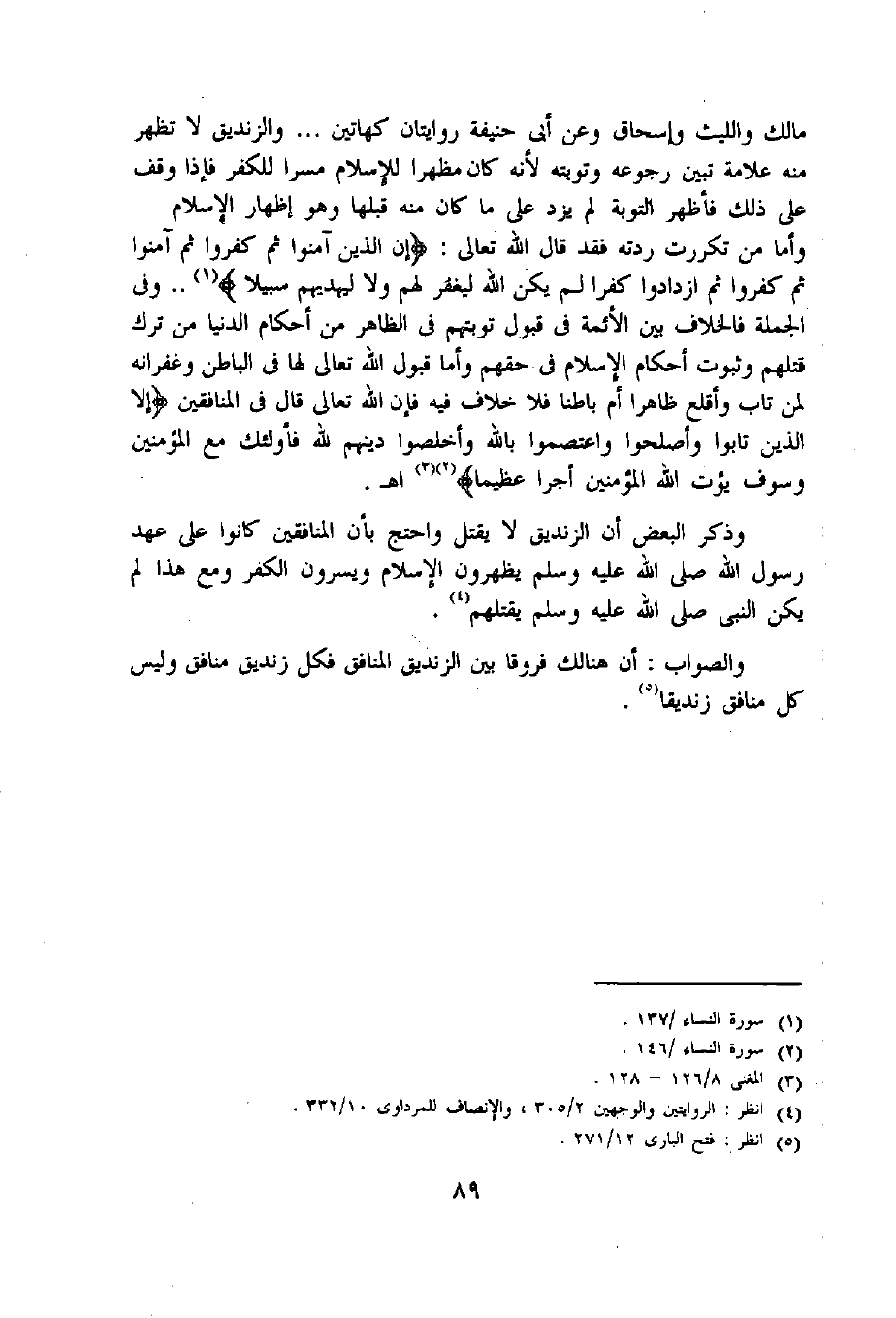 وأما من تكررت ردته فقد قال اللّه تعالى: إِنَّ الَّذِينَ آمَنُوا ثُمَّ كَفَرُوا ثُمَّ آمَنُوا ثُمَّ كَفَرُوا ثُمَّ ازْدادُوا كُفْراً لَمْ يَكُنِ اللَّهُ لِيَغْفِرَ لَهُمْ ولا لِيَهْدِيَهُمْ سَبِيلًا «1» .. وفى الجملة فالخلاف بين الأئمة فى قبول توبتهم فى الظاهر من أحكام الدنيا من ترك قتلهم وثبوت أحكام الإسلام فى حقهم وأما قبول اللّه تعالى لها فى الباطن وغفرانه لمن تاب وأقلع ظاهرا أم باطنا فلا خلاف فيه فإن اللّه تعالى قال فى المنافقين إِلَّا الَّذِينَ تابُوا وأَصْلَحُوا واعْتَصَمُوا بِاللَّهِ وأَخْلَصُوا دِينَهُمْ لِلَّهِ فَأُولئِكَ مَعَ الْمُؤْمِنِينَ وسَوْفَ يُؤْتِ اللَّهُ الْمُؤْمِنِينَ أَجْراً عَظِيماً «2» «3» اه.