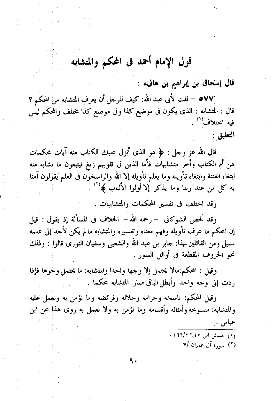 قال اللّه عز وجل: هُوَ الَّذِي أَنْزَلَ عَلَيْكَ الْكِتابَ مِنْهُ آياتٌ مُحْكَماتٌ هُنَّ أُمُّ الْكِتابِ وأُخَرُ مُتَشابِهاتٌ فَأَمَّا الَّذِينَ فِي قُلُوبِهِمْ زَيْغٌ فَيَتَّبِعُونَ ما تَشابَهَ مِنْهُ ابْتِغاءَ الْفِتْنَةِ وابْتِغاءَ تَأْوِيلِهِ وما يَعْلَمُ تَأْوِيلَهُ إِلَّا اللَّهُ والرَّاسِخُونَ فِي الْعِلْمِ يَقُولُونَ آمَنَّا بِهِ كُلٌّ مِنْ عِنْدِ رَبِّنا وما يَذَّكَّرُ إِلَّا أُولُوا الْأَلْبابِ «2».