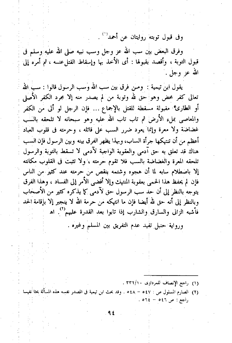 (2) الصارم المسلول ص: 547 - 548. وقد بحث ابن تيمية فى المصدر نفسه هذه المسألة بحثا نفيسا راجع: ص 546 - 564.