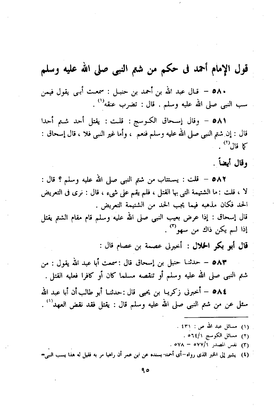 584 - أخبرنى زكريا بن يحيى قال: حدثنا أبو طالب أن أبا عبد اللّه سئل عن من شتم النبي صلى اللّه عليه وسلم قال: يقتل فقد نقض العهد «4».