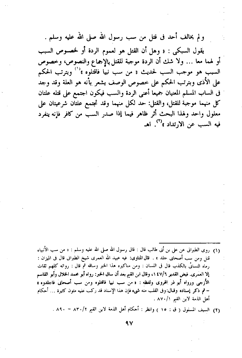 (2) السيف المسلول (ق: 15) وانظر: أحكام أهل الذمة لابن القيم 2/ 830 - 890.