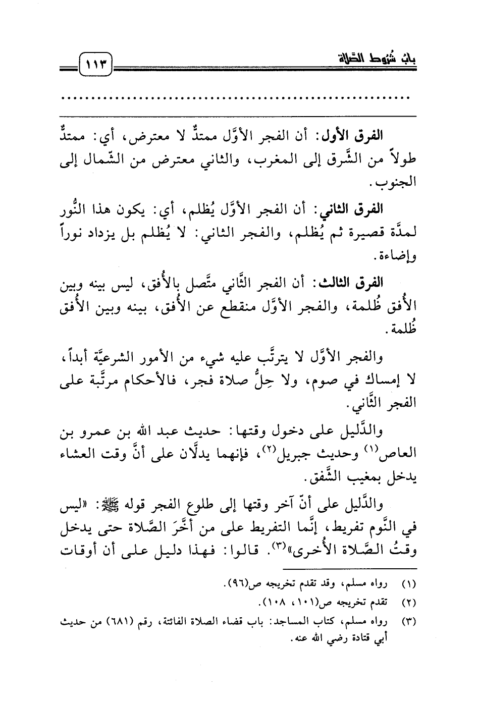 الفرق الأول: أن الفجر الأوَّل ممتدٌّ لا معترض، أي: ممتدٌّ طولاً من الشَّرق إلى المغرب، والثاني معترض من الشّمال إلى الجنوب.