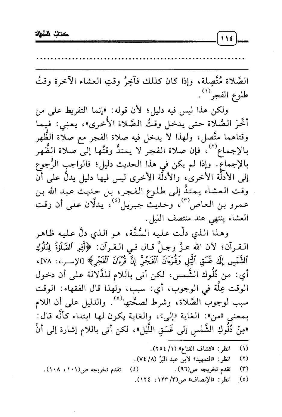ولكن هذا ليس فيه دليل؛ لأن قوله: «إنما التفريط على من أخَّرَ الصَّلاة حتى يدخل وقتُ الصَّلاة الأُخرى»، يعني: فيما وقتاهما متَّصل، ولهذا لا يدخل فيه صلاة الفجر مع صلاة الظُّهر بالإجماع (¬2)، فإن صلاة الفجر لا يمتدُّ وقتُها إلى صلاة الظُّهر بالإجماع. وإذا لم يكن في هذا الحديث دليل؛ فالواجب الرُّجوع إلى الأدلَّة الأخرى، والأدلَّة الأخرى ليس فيها دليل يدلُّ على أن وقت العشاء يمتدُّ إلى طلوع الفجر، بل حديث عبد الله بن عمرو بن العاص (¬3)، وحديث جبريل (¬4)، يدلاَّن على أن وقت العشاء ينتهي عند منتصف الليل.