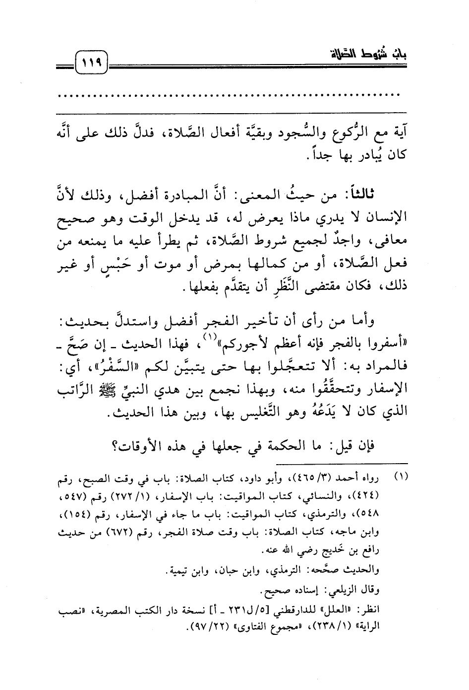 وأما من رأى أن تأخير الفجر أفضل واستدلَّ بحديث: «أسفروا بالفجر فإنه أعظم لأجوركم» (¬1)، فهذا الحديث ـ إن صَحَّ ـ فالمراد به: ألا تتعجَّلوا بها حتى يتبيَّن لكم «السَّفْرُ»، أي: الإسفار وتتحقَّقُوا منه، وبهذا نجمع بين هدي النبيِّ صلّى الله عليه وسلّم الرَّاتب الذي كان لا يَدَعُهُ وهو التَّغليس بها، وبين هذا الحديث.