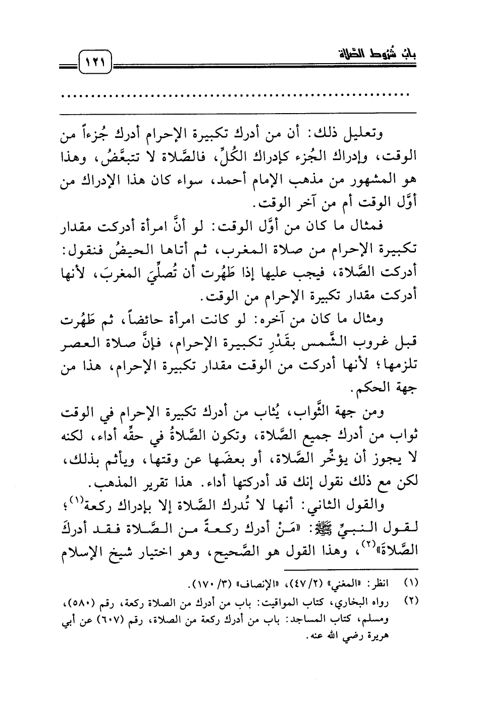 وتعليل ذلك: أن من أدرك تكبيرة الإحرام أدرك جُزءاً من الوقت، وإدراك الجُزء كإدراك الكُلِّ، فالصَّلاة لا تتبعَّضُ، وهذا هو المشهور من مذهب الإمام أحمد، سواء كان هذا الإدراك من أوَّل الوقت أم من آخر الوقت.