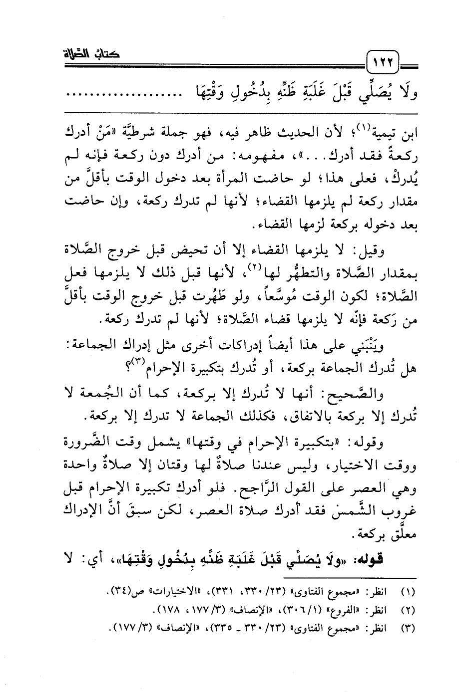 ابن تيمية (¬1)؛ لأن الحديث ظاهر فيه، فهو جملة شرطيَّة «مَنْ أدرك ركعةً فقد أدرك ... »، مفهومه: من أدرك دون ركعة فإنه لم يُدركْ، فعلى هذا؛ لو حاضت المرأة بعد دخول الوقت بأقلَّ من مقدار ركعة لم يلزمها القضاء؛ لأنها لم تدرك ركعة، وإن حاضت بعد دخوله بركعة لزمها القضاء.