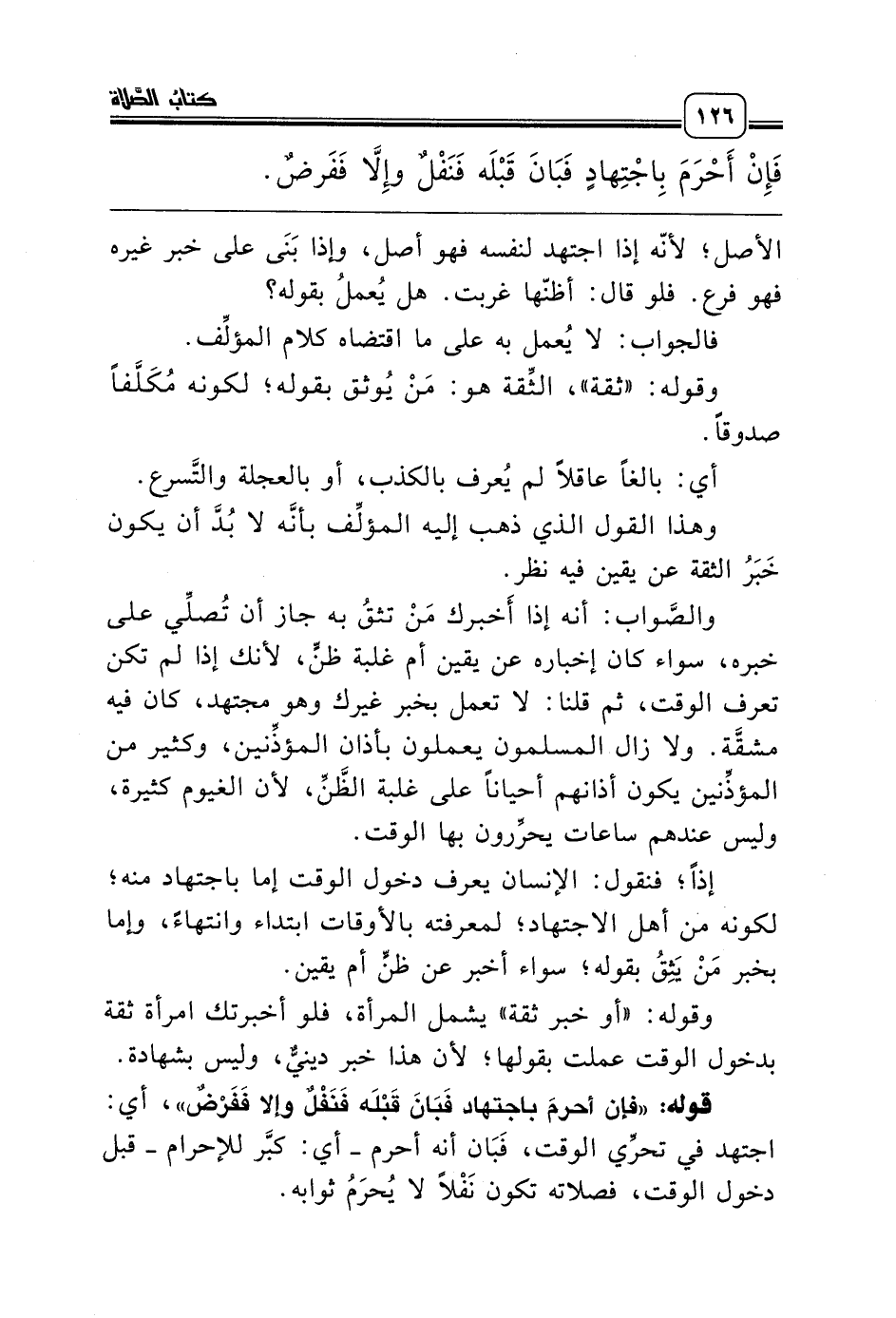 والصَّواب: أنه إذا أَخبرك مَنْ تثقُ به جاز أن تُصلِّي على خبره، سواء كان إخباره عن يقين أم غلبة ظنٍّ، لأنك إذا لم تكن تعرف الوقت، ثم قلنا: لا تعمل بخبر غيرك وهو مجتهد، كان فيه مشقَّة. ولا زال المسلمون يعملون بأذان المؤذِّنين، وكثير من المؤذِّنين يكون أذانهم أحياناً على غلبة الظَّنِّ، لأن الغيوم كثيرة، وليس عندهم ساعات يحرِّرون بها الوقت.