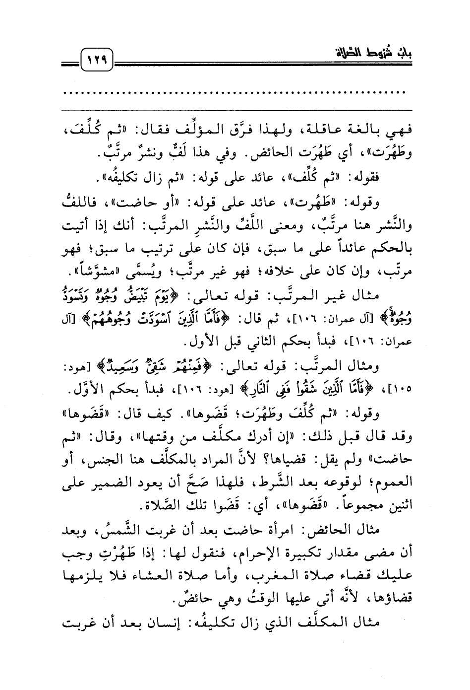 فهي بالغة عاقلة، ولهذا فرَّق المؤلِّف فقال: «ثم كُلِّفَ، وطَهُرَت»، أي طَهُرَت الحائض. وفي هذا لَفٌّ ونشرٌ مرتَّبٌ.