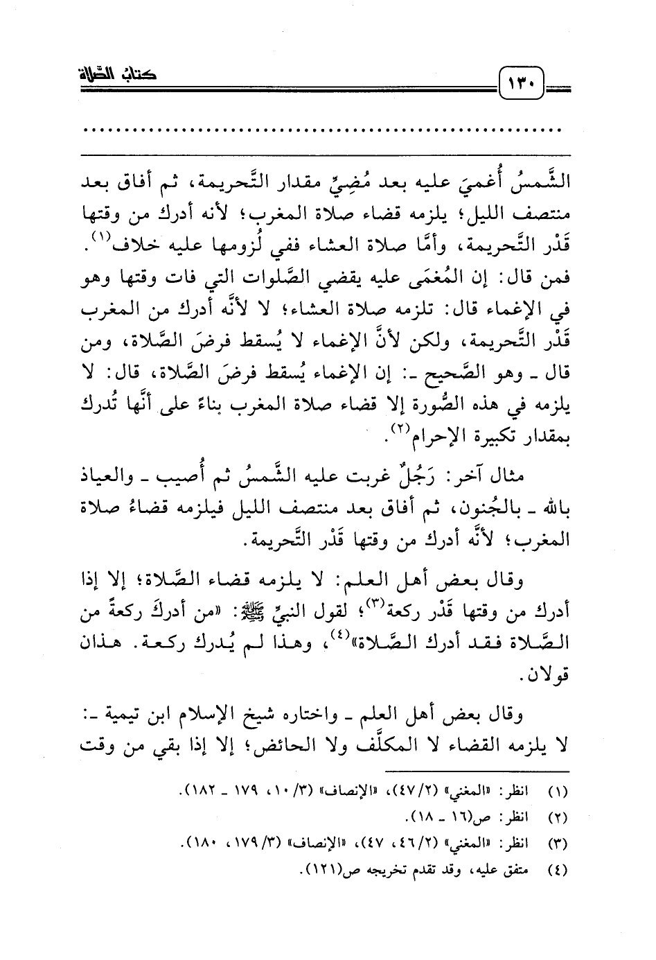 مثال آخر: رَجُلٌ غربت عليه الشَّمسُ ثم أُصيب ـ والعياذ بالله ـ بالجُنون، ثم أفاق بعد منتصف الليل فيلزمه قضاءُ صلاة المغرب؛ لأنَّه أدرك من وقتها قَدْر التَّحريمة.