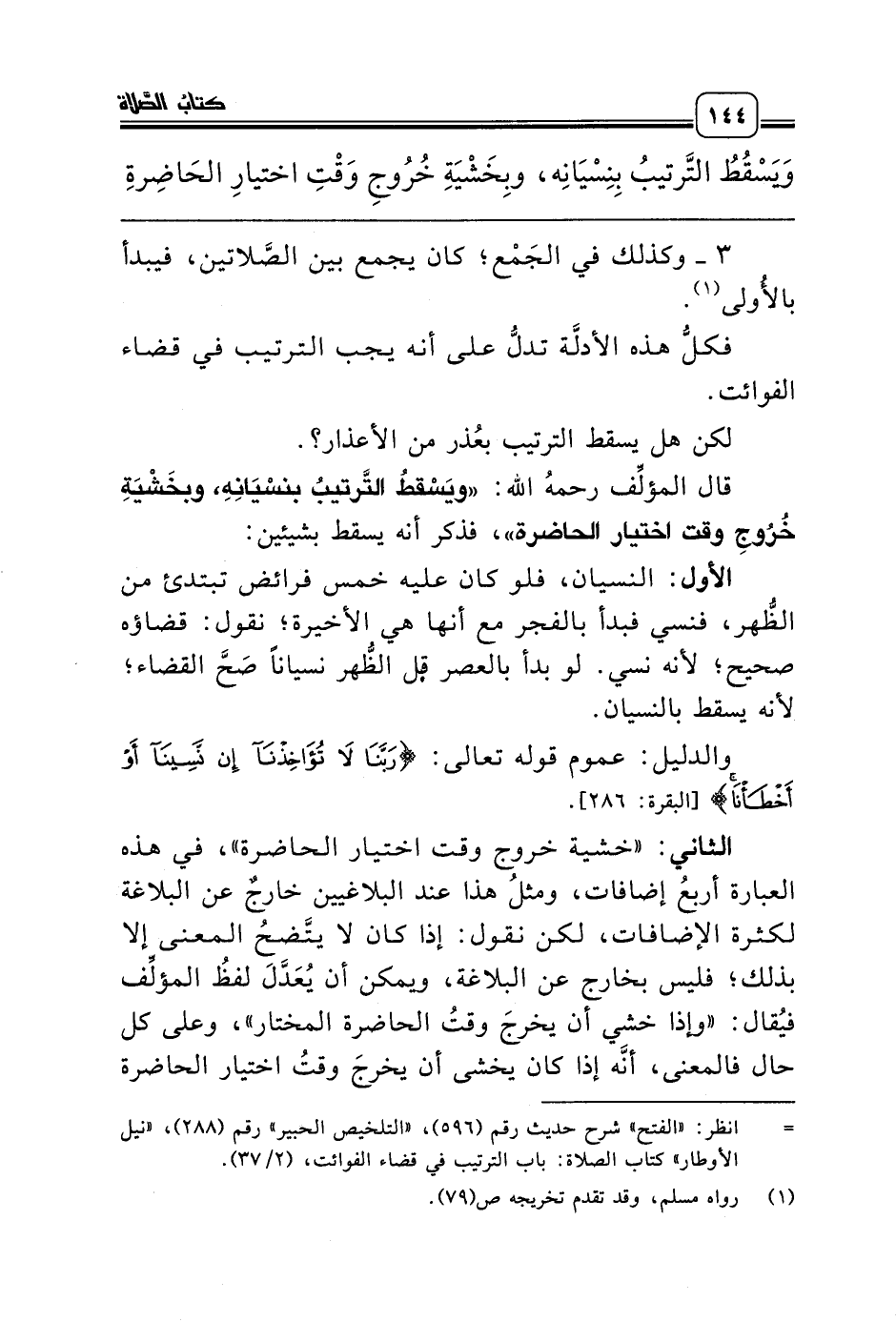 وَيَسْقُطُ التَّرتيبُ بِنِسْيَانِه، وبِخَشْيَةِ خُرُوجِ وَقْتِ اختيارِ الحَاضِرةِ ..........