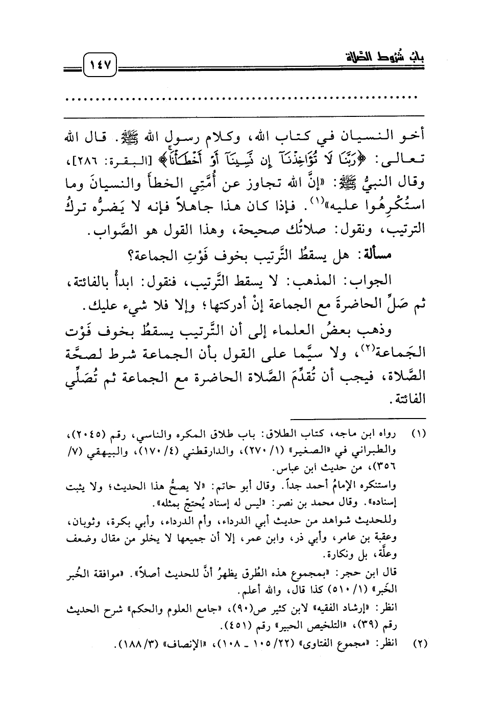 أخو النسيان في كتاب الله، وكلام رسول الله صلّى الله عليه وسلّم. قال الله تعالى: {رَبَّنَا لاَ تُؤَاخِذْنَا إِنْ نَسِيْنَا أَوْ أَخْطَأْنَا} [البقرة: 286]، وقال النبيُّ صلّى الله عليه وسلّم: «إنَّ الله تجاوز عن أُمَّتِي الخطأَ والنسيانَ وما استُكْرِهُوا عليه» (¬1). فإذا كان هذا جاهلاً فإنه لا يَضرُّه تركُ الترتيب، ونقول: صلاتُك صحيحة، وهذا القول هو الصَّواب.